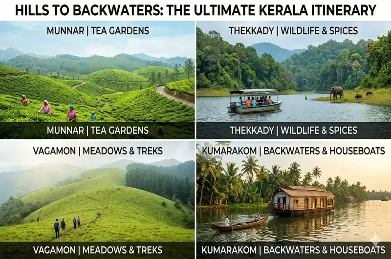 Experience the rhythmic balance of God’s Own Country. This meticulously crafted route takes you from the emerald tea carpets of Munnar and the wild ...