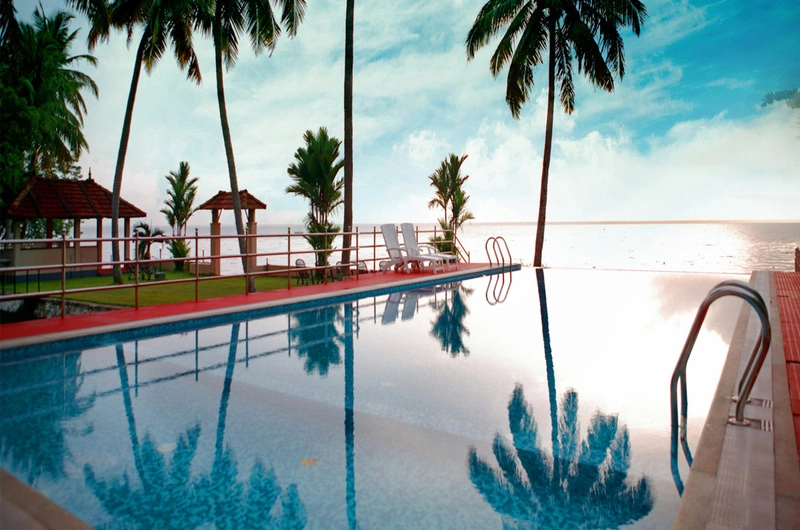 Infinity swimming pool with views of the back-water lake and sunset. - On-site restaurant and dining area, serving Kerala specialties alongside Indian & international dishes.