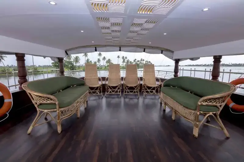 Relax on the front sundeck or the upper floor, soaking in panoramic views of the coconut-lined canals and vibrant village life. The boat includes a spacious living-cum-dining area, where you’ll be treated to authentic Kerala cuisine prepared by the onboard chef.